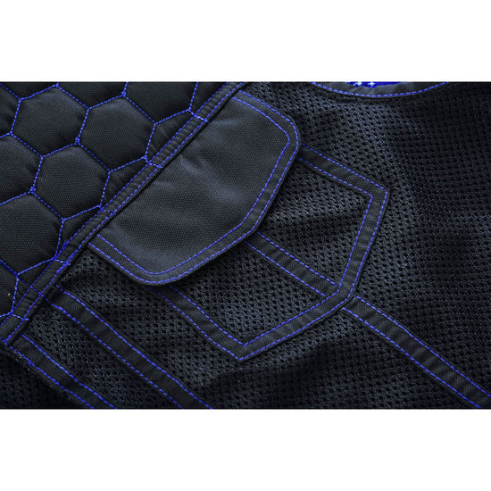 Our Cold Burn Black and Blue Mesh Textile Vest features a durable mesh construction with vibrant black accents. It includes concealed carry and secure chest pockets with snap button closures for convenience. The hidden front zipper with snap-placket reinforced stitching and built-in hanging loop adds to its practicality and style. This vest is perfect for those who want a striking, functional Vest to match their riding styles.