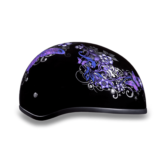 Our D.O.T. Daytona Slim Line Skull Cap 1/2 Shell Helmet In The Butterfly Graphic, Meets And Exceeds D.O.T. FMVSS 218 Standards And Is The Smallest D.O.T. 1/2 Shell Helmet Ever Made!! With 3 Different Shell Sizes, You're Sure To Get That Proportionate Fit!! Each Graphic Item Is Custom Designed And May Vary In Color Or Composition. Available Without Snaps/Visor Only. Many More Colors And Designs Available. Free Head Wrap And Cloth Draw String Bag Included. Sizes Range From 2XS-2XL.