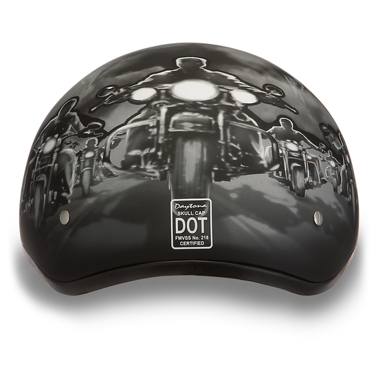 Our D.O.T. Daytona Slim Line Skull Cap 1/2 Shell Helmet In The Guns Graphic, Meets And Exceeds D.O.T. FMVSS 218 Standards And Is The Smallest D.O.T. 1/2 Shell Helmet Ever Made!! With 3 Different Shell Sizes, You're Sure To Get That Proportionate Fit!! Each Graphic Item Is Custom Designed And May Vary In Color Or Composition. Available Without Snaps/Visor Only. Many More Colors And Designs Available. Free Head Wrap And Cloth Draw String Bag Included. Sizes Range From 2XS-2XL.