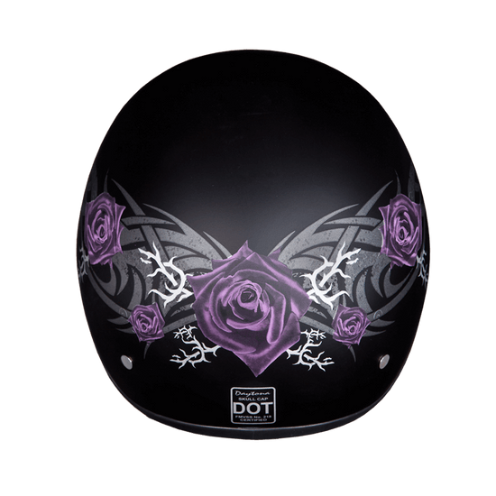 Our D.O.T. Daytona Slim Line Skull Cap 1/2 Shell Helmet In The Purple Rose Graphic, Meets And Exceeds D.O.T. FMVSS 218 Standards And Is The Smallest D.O.T. 1/2 Shell Helmet Ever Made!! With 3 Different Shell Sizes, You're Sure To Get That Proportionate Fit!! Each Graphic Item Is Custom Designed And May Vary In Color Or Composition. Available Without Snaps/Visor Only. Many More Colors And Designs Available. Free Head Wrap And Cloth Draw String Bag Included. Sizes Range From 2XS-2XL.