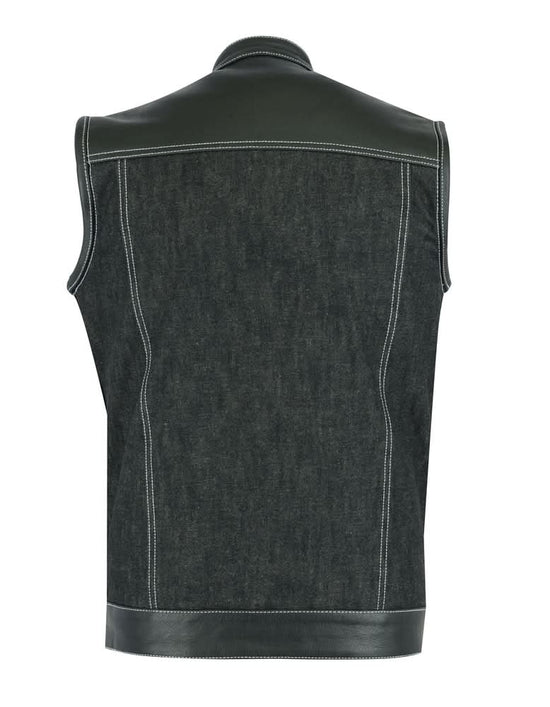 Men's Leather-Denim Combo Motorcycle Vest w/ Scoop Collar