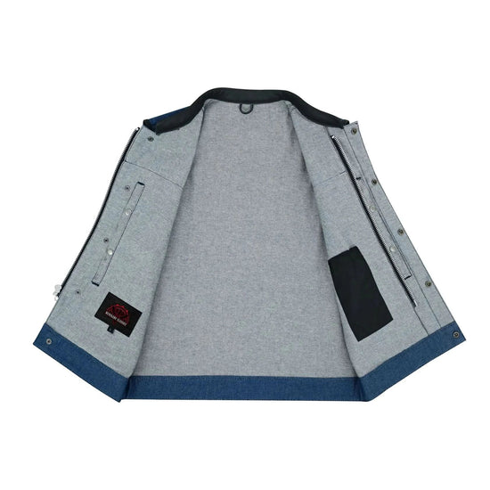 Men's Upgraded Broken Blue Denim Motorcycle Vest w/Leather Trimming