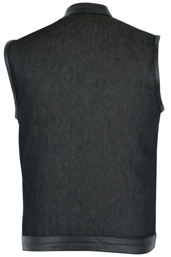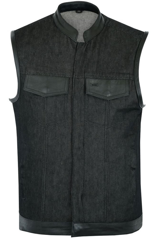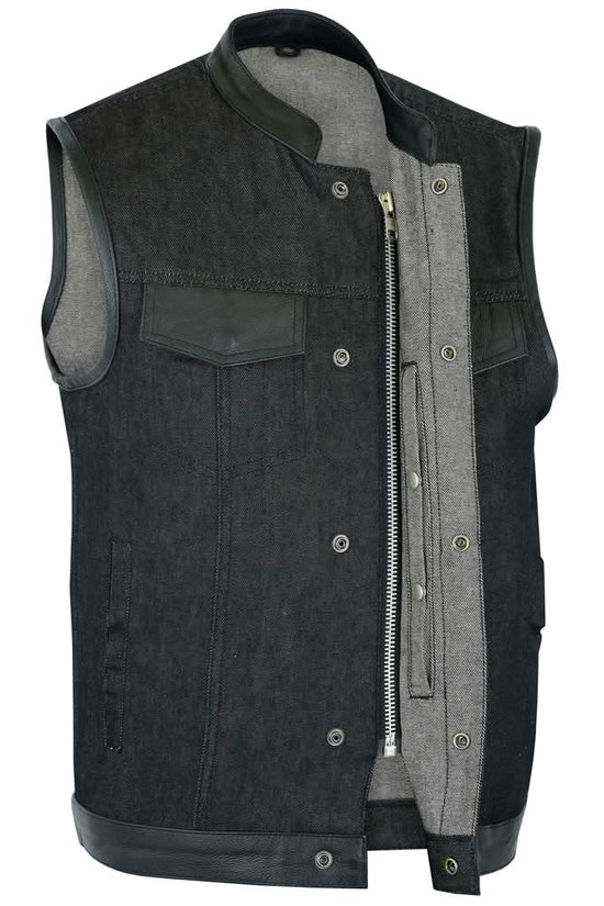 Men's Upgraded Rough Rub-Off Denim Motorcycle Vest w/Leather Trim