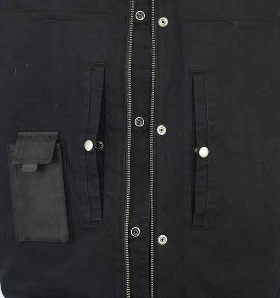 2 upgraded style concealed gun pockets between the snap and the zipper made of special heavy-duty textile with built-in holsters and snap closure.