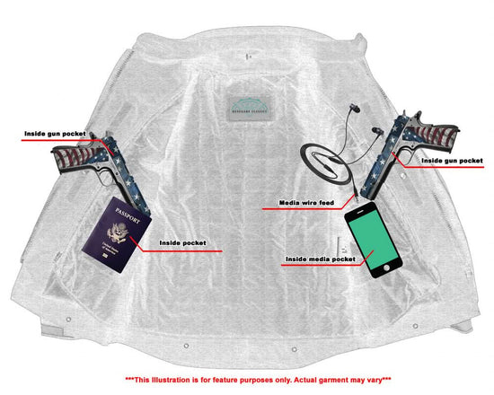 2 inside concealed Smart Access Pocket made of special heavy-duty textile with built-in holsters and snap closure.