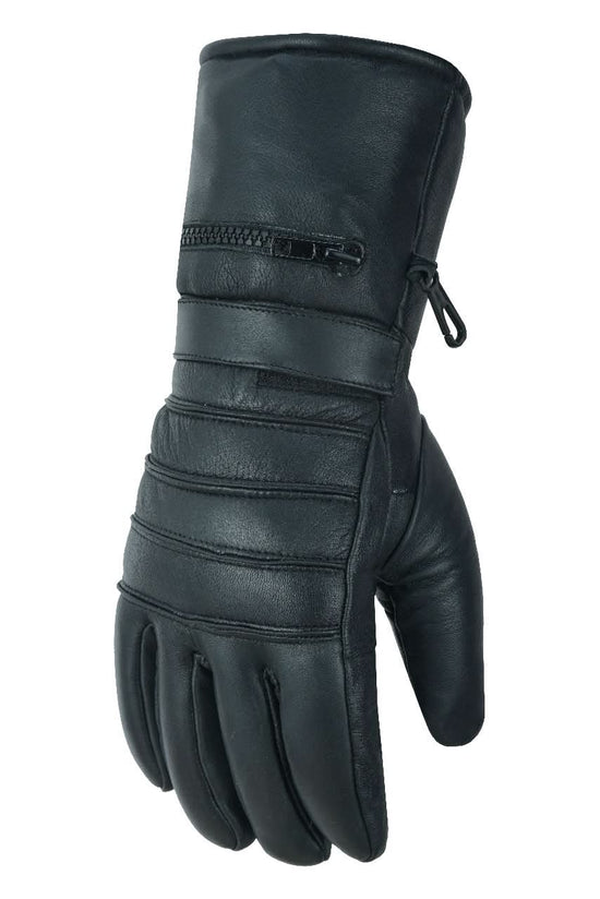 Men's cold weather insulated lined glove features water repellant rain mitt in zippered gauntlet.