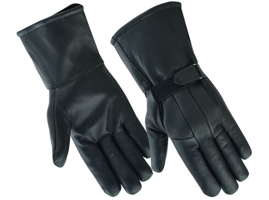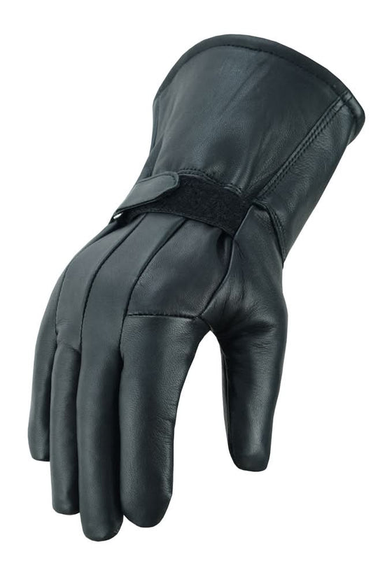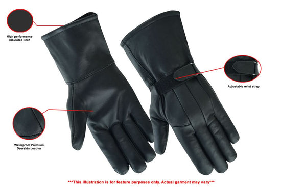Men's waterproof gauntlet glove featuring high performance insulated liner for extra warmth and adjustable wrist strap. Made of premium Deerskin Leather.