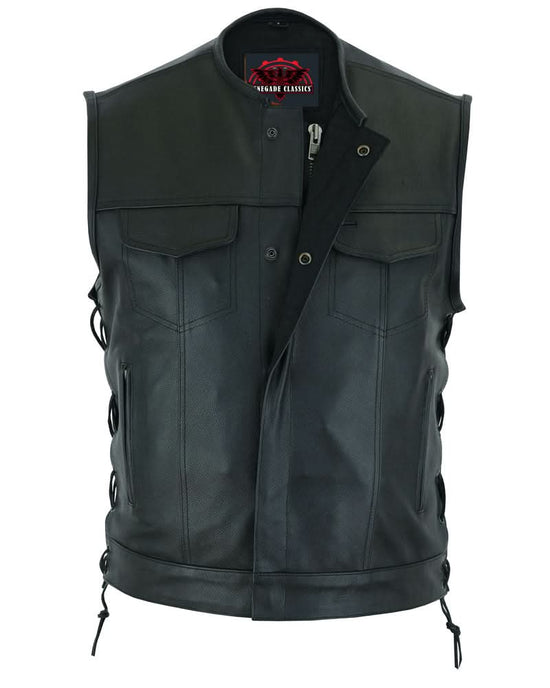 Men's Combat Black motorcycle Leather Vest - Gun Pockets & Side Laces