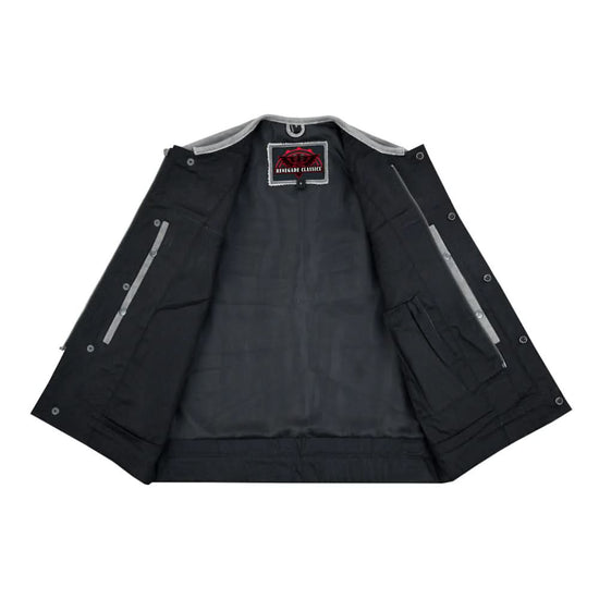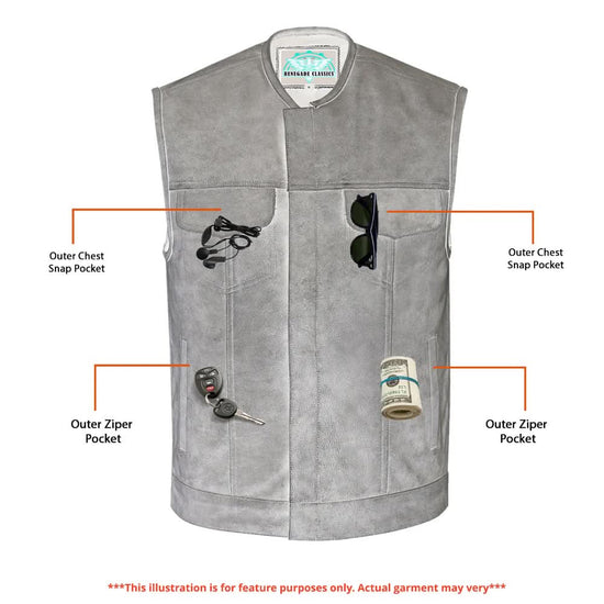 Leather vests are the perfect versatile piece of outerwear. Our men's single panel concealment biker vest without a collar is made from soft, premium drum-dyed gray cowhide 1.2 - 1.3mm. This version has no collar for a sleek look.