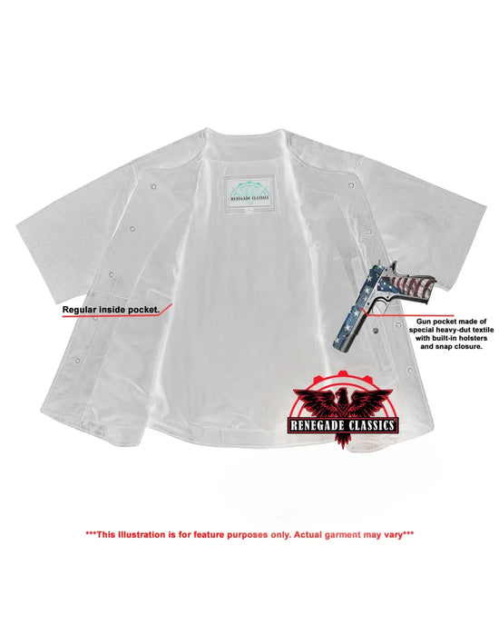 1 inside left side concealed gun pocket made of special heavy-duty textile with built-in holsters and snap closure.