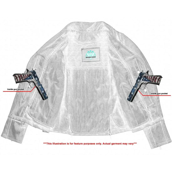 2 inside concealed gun pockets made of special heavy-duty textile with built-in holsters and snap closure.