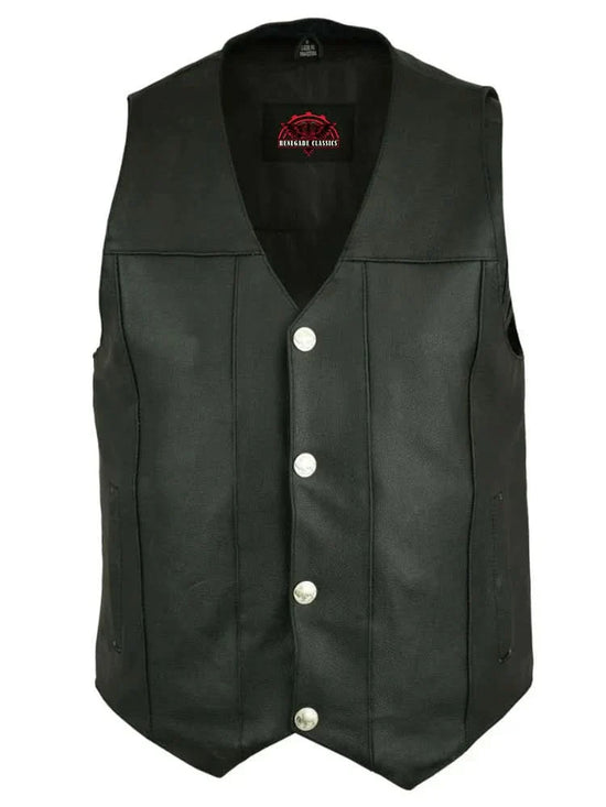 This vest is made from milled promo cowhide 1.1 - 1.2mm for comfort and durability, and it is fully lined for smooth comfort over a T-shirt or a leather jacket. The buffalo nickel snaps are a unique addition that adds custom flair to the design.