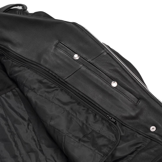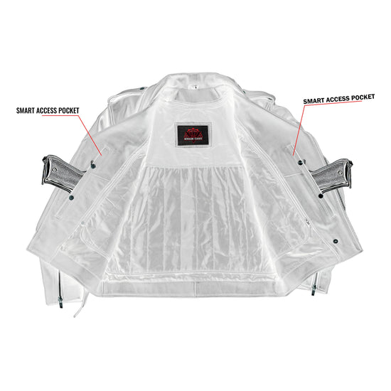 2 upgraded style concealed gun pockets between the snap and the zipper made of special heavy duty textile with built-in holsters and snap closure.