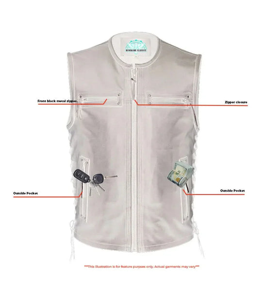 Our men's zipper front single back panel gun pocket biker vest is a classic, functional piece. It is made from soft, premium-grade milled cowhide 1.2 - 1.3mm and has an interior liner. The front zipper keeps the vest closed and rain and wind out.
