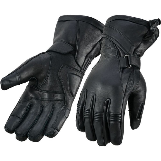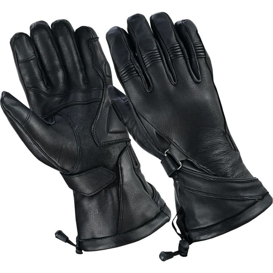 Men's waterproof gauntlet glove featuring high performance insulated liner for extra warmth with rain viper on thumb, reflective piping, touch screen finger tips and adjustable wrist strap. Made in premium Deerskin Leather.