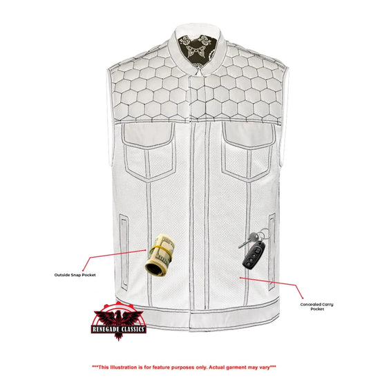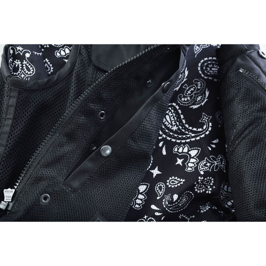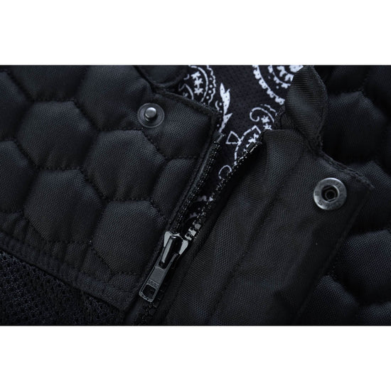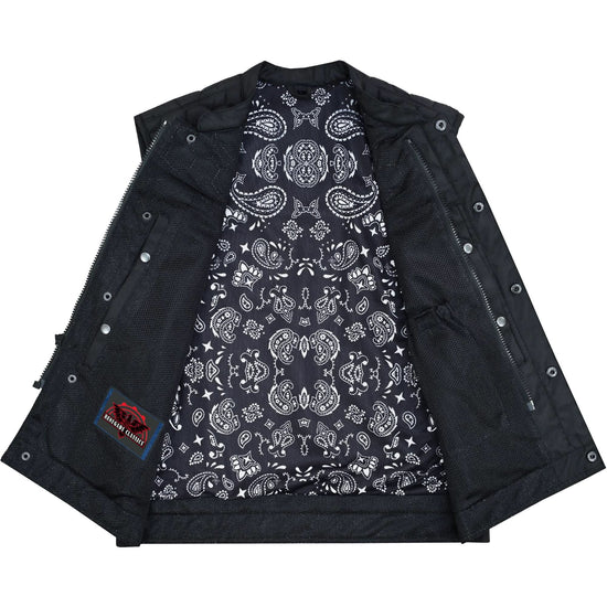 Our Mesh Heat Black Textile Vest features a durable mesh construction with vibrant black accents. It includes concealed carry and secure chest pockets with snap button closures for convenience. The hidden front zipper with snap-placket reinforced stitching and built-in hanging loop adds to its practicality and style. This vest is perfect for those who want a striking, functional Vest to match their riding styles.Â