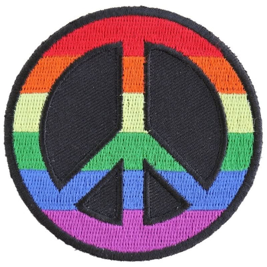 Rainbow Peace Patch measures 3x3 inches and is Embroidered in Black / Red / Orange / Yellow / Green / Blue / Purple. The Small Patch can be sewn on or ironed on to clothing such as Denim or Leather Jackets, Vests, Hats, Back Packs, Shirts. Features plastic backing and embroidered die cut borders.