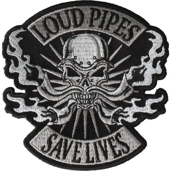 Loud Pipes Save Lives Skull Patch measures 3.9x4 inches and is Embroidered in Black / White / Gray. The Small can be sewn on or ironed on to clothing. The Loud Pipes Save Lives Skull Patch features plastic iron on backing and clean laser cut embroidered borders.