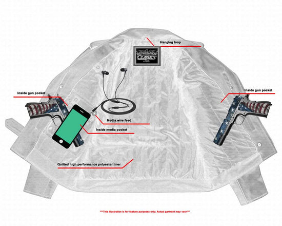 - 2 inside concealed gun pockets made of special heavy-duty textile with built-in holsters and snap closure.