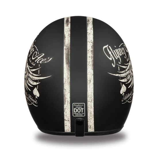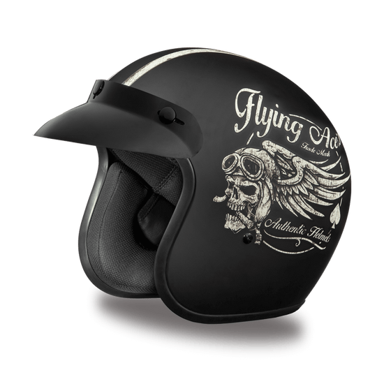 Our D.O.T. Daytona Cruiser 3/4 Shell Helmet In The Flying Ace's Graphic, Meets And Exceeds D.O.T. FMVSS 218 Standards And Is The Smallest D.O.T. 3/4 Shell Helmet Ever Made!! With 3 Different Shell Sizes, You're Sure To Get That Proportionate Fit!! Available Only With Removable, Snap On Gloss Black Bubble Visor. Many More Colors And Designs Available. Free Head Wrap And Cloth Draw String Bag Included. Sizes Range From XS-2XL.