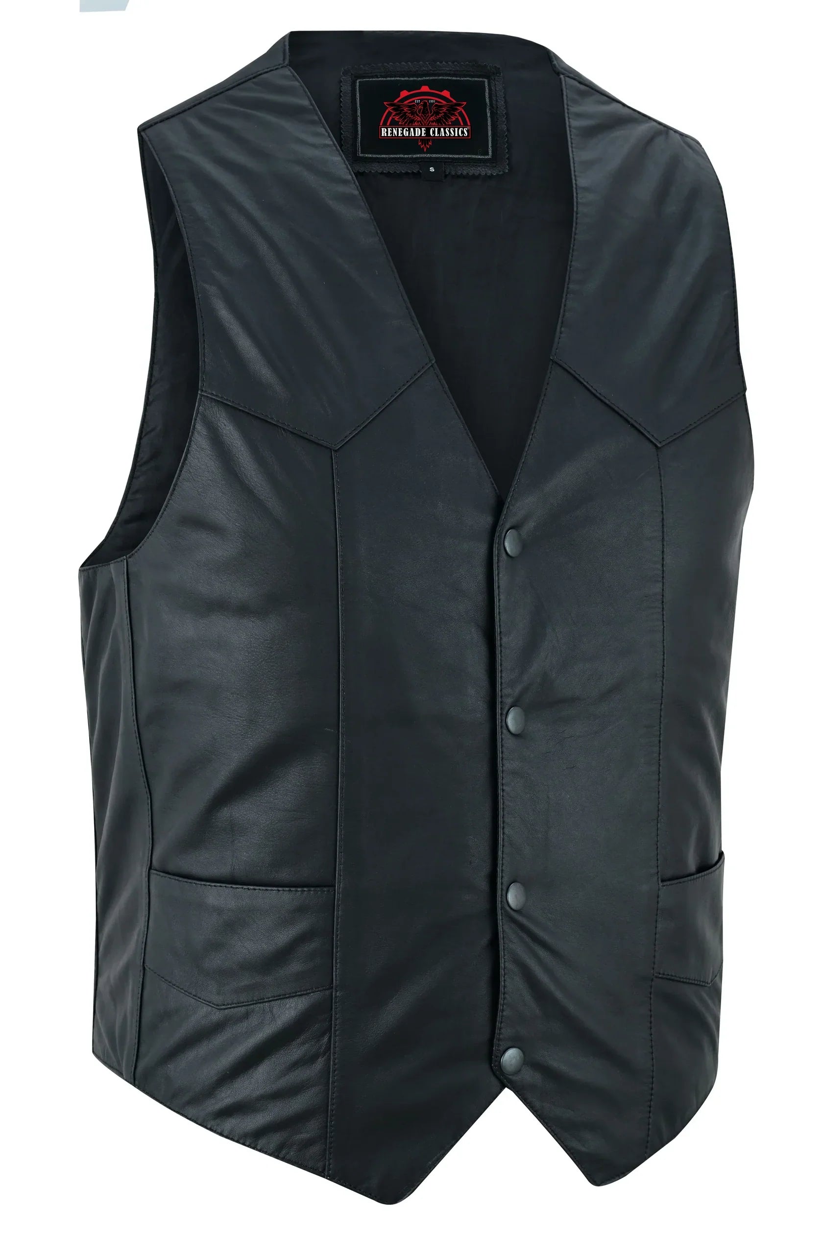 This vest is made from soft, drum-dyed goat hide and fully lined for all-around comfort. The linework and black leather coincide with the traditional biker style. If you want a go-to vest for any occasion, this lightweight option is perfect for you.